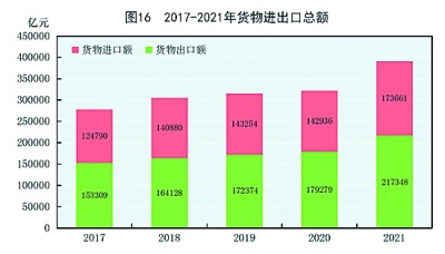 全年貨物進出口總額391009億元,比上年增長21.4%。其中,出口217348億元,增長21.2%;進口173661億元,增長21.5%。貨物進出口順差43687億元,比上年增加7344億元。對“一帶一路”[44]沿線國家進出口總額115979億元,比上年增長23.6%。其中,出口65924億元,增長21.5%;進口50055億元,增長26.4%。(見圖16)(見表9)(見表10)(見表11)(見表12)