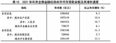全年社會融資規(guī)模增量[45]31.4萬億元,按可比口徑計算,比上年少3.4萬億元。年末社會融資規(guī)模存量[46]314.1萬億元,按可比口徑計算,比上年末增長10.3%,其中對實體經(jīng)濟發(fā)放的人民幣貸款余額191.5萬億元,增長11.6%。年末全部金融機構(gòu)本外幣各項存款余額238.6萬億元,比年初增加20.2萬億元,其中人民幣各項存款余額232.3萬億元,增加19.7萬億元。全部金融機構(gòu)本外幣各項貸款余額198.5萬億元,增加20.1萬億元,其中人民幣各項貸款余額192.7萬億元,增加19.9萬億元。人民幣普惠金融貸款[47]余額26.5萬億元,增加5.0萬億元。(見表15)