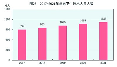 年末全國共有醫(yī)療衛(wèi)生機構(gòu)103.1萬個,其中醫(yī)院3.7萬個,在醫(yī)院中有公立醫(yī)院1.2萬個,民營醫(yī)院2.5萬個;基層醫(yī)療衛(wèi)生機構(gòu)97.7萬個,其中鄉(xiāng)鎮(zhèn)衛(wèi)生院3.5萬個,社區(qū)衛(wèi)生服務(wù)中心(站)3.6萬個,門診部(所)30.7萬個,村衛(wèi)生室59.9萬個;專業(yè)公共衛(wèi)生機構(gòu)1.3萬個,其中疾病預(yù)防控制中心3380個,衛(wèi)生監(jiān)督所(中心)2790個。年末衛(wèi)生技術(shù)人員1123萬人,其中執(zhí)業(yè)醫(yī)師和執(zhí)業(yè)助理醫(yī)師427萬人,注冊護士502萬人。醫(yī)療衛(wèi)生機構(gòu)床位957萬張,其中醫(yī)院748萬張,鄉(xiāng)鎮(zhèn)衛(wèi)生院144萬張。全年總診療人次[70]85.3億人次,出院人數(shù)[71]2.4億人。截至年末,全國累計報告新型冠狀病毒肺炎確診病例102314例,累計治愈出院病例94792例,累計死亡4636人。全國累計報告接種新型冠狀病毒疫苗283533萬劑次。全國共有11937家醫(yī)療衛(wèi)生機構(gòu)提供新型冠狀病毒核酸檢測服務(wù),總檢測能力達到4168萬份/天。(見圖23)