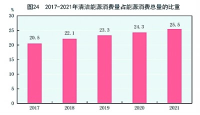 初步核算,全年能源消費總量52.4億噸標(biāo)準(zhǔn)煤,比上年增長5.2%。煤炭消費量增長4.6%,原油消費量增長4.1%,天然氣消費量增長12.5%,電力消費量增長10.3%。煤炭消費量占能源消費總量的56.0%,比上年下降0.9個百分點;天然氣、水電、核電、風(fēng)電、太陽能發(fā)電等清潔能源消費量占能源消費總量的25.5%,上升1.2個百分點。重點耗能工業(yè)企業(yè)單位電石綜合能耗下降5.3%,單位合成氨綜合能耗與上年持平,噸鋼綜合能耗下降0.4%,單位電解鋁綜合能耗下降2.1%,每千瓦時火力發(fā)電標(biāo)準(zhǔn)煤耗下降0.5%。全國萬元國內(nèi)生產(chǎn)總值二氧化碳排放[78]下降3.8%。(見圖24)