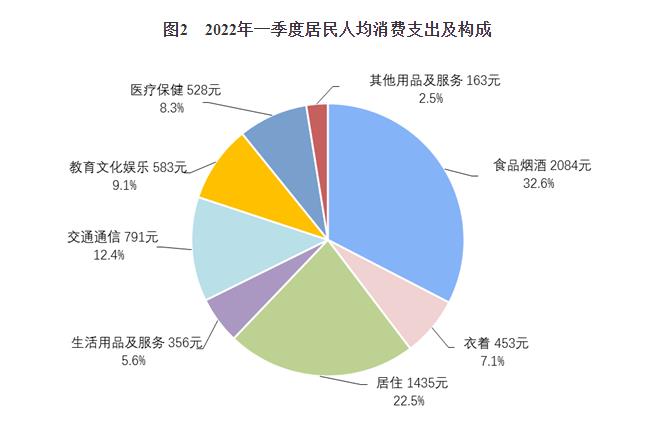 據(jù)悉,一季度,全國(guó)居民人均消費(fèi)支出6393元,比上年名義增長(zhǎng)6.9%,扣除價(jià)格因素影響,實(shí)際增長(zhǎng)5.7%。分城鄉(xiāng)看,城鎮(zhèn)居民人均消費(fèi)支出7924元,增長(zhǎng)5.7%,扣除價(jià)格因素,實(shí)際增長(zhǎng)4.4%;農(nóng)村居民人均消費(fèi)支出4388元,增長(zhǎng)8.6%,扣除價(jià)格因素,實(shí)際增長(zhǎng)7.8%。一季度,全國(guó)居民人均食品煙酒消費(fèi)支出2084元,增長(zhǎng)4.9%,占人均消費(fèi)支出的比重為32.6%;人均衣著消費(fèi)支出453元,增長(zhǎng)3.6%,占人均消費(fèi)支出的比重為7.1%;人均居住消費(fèi)支出1435元,增長(zhǎng)6.7%,占人均消費(fèi)支出的比重為22.5%;人均生活用品及服務(wù)消費(fèi)支出356元,增長(zhǎng)4.8%,占人均消費(fèi)支出的比重為5.6%;人均交通通信消費(fèi)支出791元,增長(zhǎng)12.7%,占人均消費(fèi)支出的比重為12.4%;人均教育文化娛樂消費(fèi)支出583元,增長(zhǎng)6.9%,占人均消費(fèi)支出的比重為9.1%;人均醫(yī)療保健消費(fèi)支出528元,增長(zhǎng)9.1%,占人均消費(fèi)支出的比重為8.3%;人均其他用品及服務(wù)消費(fèi)支出163元,增長(zhǎng)17.1%,占人均消費(fèi)支出的比重為2.5%。