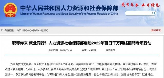 近日,人力資源和社會保障部會同有關(guān)方面啟動實施“職等你來 就業(yè)同行”百日千萬網(wǎng)絡(luò)招聘專項行動,搭建全國統(tǒng)一、多方聯(lián)動的網(wǎng)絡(luò)招聘平臺。行動將持續(xù)至8月25日,預(yù)計提供超千萬個就業(yè)崗位。此次專項行動主會場設(shè)在:中國公共招聘網(wǎng)、中國國家人才網(wǎng)、“就業(yè)在線”,并開設(shè)就業(yè)導引地圖,鏈接各省招聘分會場和相關(guān)社會參與方。