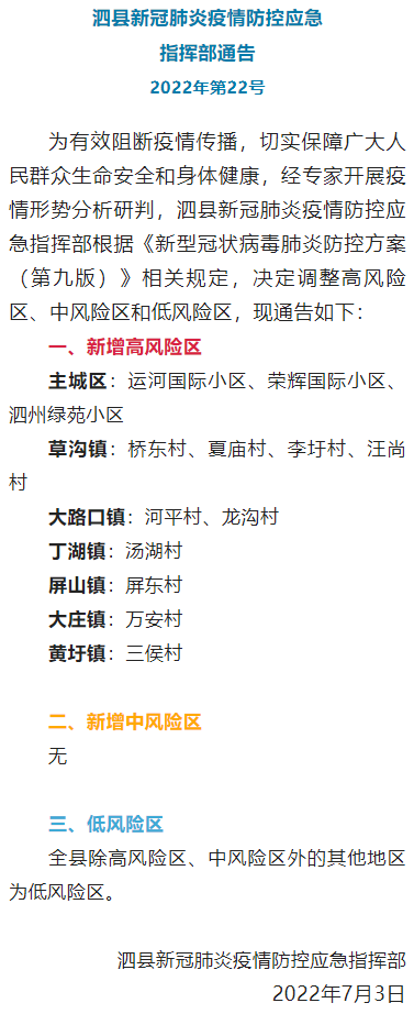 今日,安徽泗縣新冠肺炎疫情防控應(yīng)急指揮部發(fā)布通告,全縣范圍內(nèi)新增13個(gè)高風(fēng)險(xiǎn)區(qū)。詳情如下:為有效阻斷疫情傳播,切實(shí)保障廣大人民群眾生命安全和身體健康,經(jīng)專家開展疫情形勢分析研判,泗縣新冠肺炎疫情防控應(yīng)急指揮部根據(jù)《新型冠狀病毒肺炎防控方案(第九版)》相關(guān)規(guī)定,決定調(diào)整高風(fēng)險(xiǎn)區(qū)、中風(fēng)險(xiǎn)區(qū)和低風(fēng)險(xiǎn)區(qū),現(xiàn)通告如下: