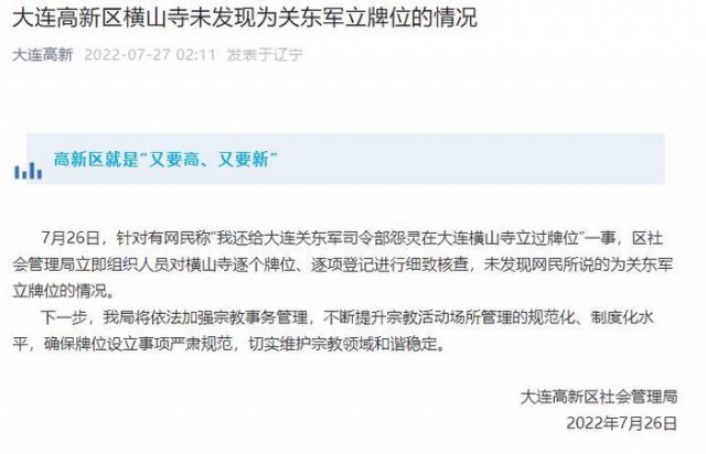 大連高新區(qū)橫山寺為關(guān)東軍立牌位?官方回應(yīng):未發(fā)現(xiàn)該情況