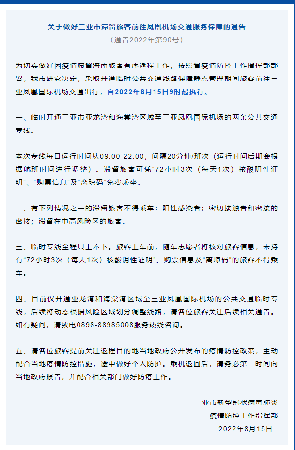 8月15日,海南三亞市新型冠狀病毒肺炎疫情防控工作指揮部發(fā)布通告,開通滯留旅客前往鳳凰機(jī)場公交專線,詳情如下: