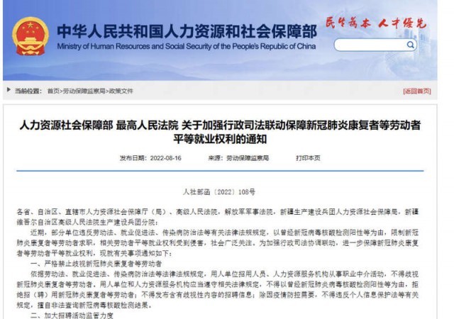 中國青年報(bào)客戶端北京8月16日電(中青報(bào)·中青網(wǎng)記者 李桂杰)人力資源和社會(huì)保障部、最高人民法院今天發(fā)布《關(guān)于加強(qiáng)行政司法聯(lián)動(dòng)保障新冠肺炎康復(fù)者等勞動(dòng)者平等就業(yè)權(quán)利的通知》(以下簡稱《通知》),再次重申嚴(yán)格禁止歧視新冠肺炎康復(fù)者等勞動(dòng)者,并就加強(qiáng)就業(yè)歧視案件審理工作作出部署。