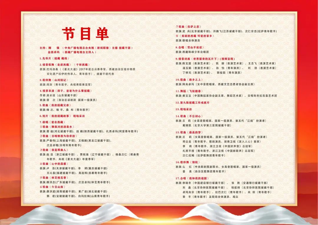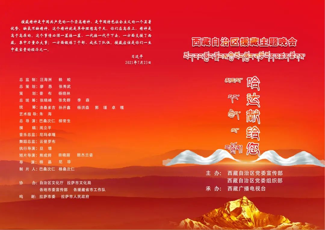 為展現(xiàn)援藏工作成就,弘揚援藏精神,表達西藏各族干部群眾對習近平總書記和黨中央的親切關(guān)懷、全國人民無私支援特別是對援藏干部人才的敬意和感恩之情,由自治區(qū)黨委宣傳部、自治區(qū)黨委組織部共同主辦的援藏主題晚會《哈達獻給您》將于8月18日晚,在西藏衛(wèi)視(《西藏新聞聯(lián)播》后)、西藏藏語衛(wèi)視(19:30左右)播出,自治區(qū)七地市廣播電視臺將同步播出(地市《新聞聯(lián)播》后)。