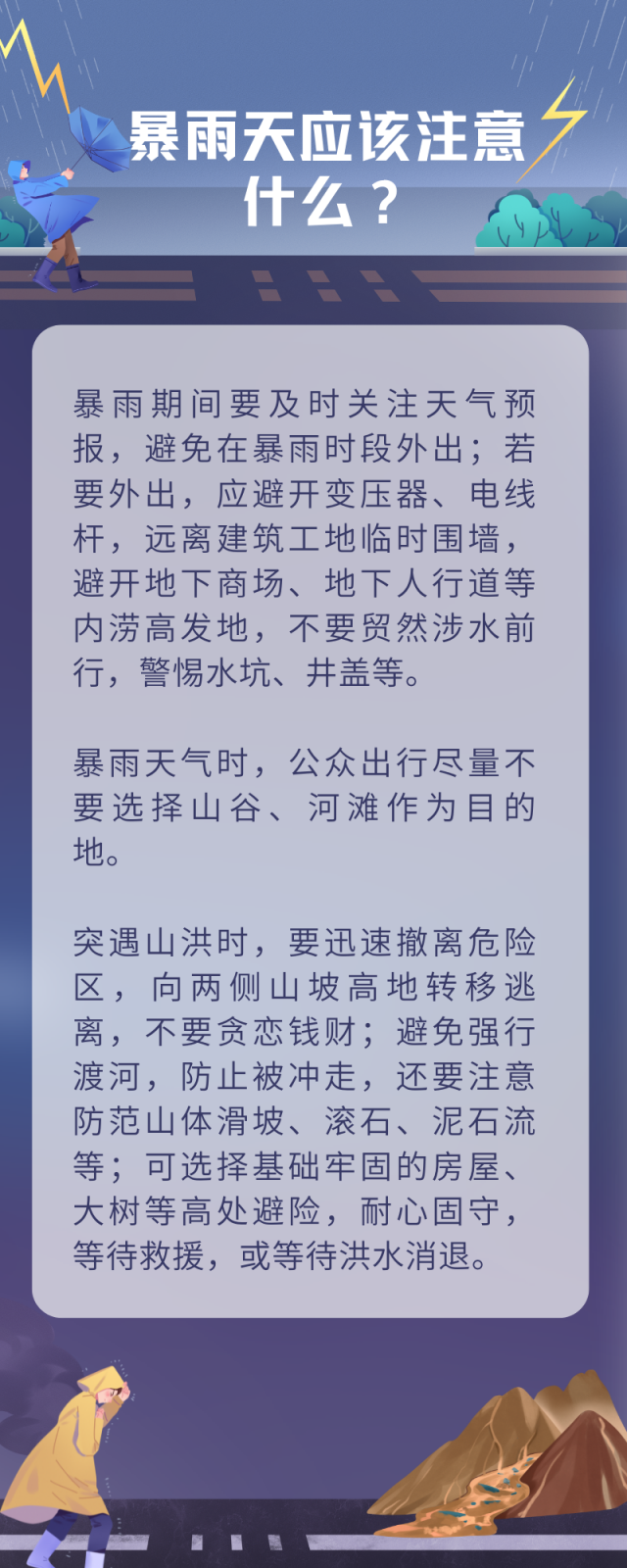 暴雨天應(yīng)該注意什么?業(yè)內(nèi)專家建議,暴雨期間要及時(shí)關(guān)注天氣預(yù)報(bào),避免在暴雨時(shí)段外出;若要外出,應(yīng)避開(kāi)變壓器、電線桿,遠(yuǎn)離建筑工地臨時(shí)圍墻,避開(kāi)地下商場(chǎng)、地下人行道等內(nèi)澇高發(fā)地,不要貿(mào)然涉水前行,警惕水坑、井蓋等。