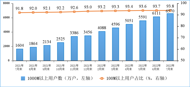 固定寬帶接入用戶(hù)規(guī)模穩(wěn)步增長(zhǎng),千兆用戶(hù)數(shù)持續(xù)擴(kuò)大。截至7月末,三家基礎(chǔ)電信企業(yè)的固定互聯(lián)網(wǎng)寬帶接入用戶(hù)總數(shù)達(dá)5.66億戶(hù),比上年末凈增3070萬(wàn)戶(hù)。其中,100Mbps及以上接入速率的固定互聯(lián)網(wǎng)寬帶接入用戶(hù)達(dá)5.31億戶(hù),占總用戶(hù)數(shù)的93.8%,占比較上年末提升0.8個(gè)百分點(diǎn);1000Mbps及以上接入速率的固定互聯(lián)網(wǎng)寬帶接入用戶(hù)達(dá)6570萬(wàn)戶(hù),比上年末凈增3112萬(wàn)戶(hù),占總用戶(hù)數(shù)的11.6%。