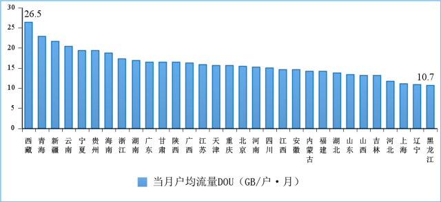 中部地區(qū)移動(dòng)互聯(lián)網(wǎng)接入流量增速領(lǐng)先,西部部分省份DOU值居全國(guó)前列。1—7月份,東、中、西部和東北地區(qū)移動(dòng)互聯(lián)網(wǎng)接入流量分別達(dá)到622.1億GB、330.6億GB、434.6億GB和75.5億GB,同比增長(zhǎng)19.1%、20.5%、19.4%和12.5%。西藏、青海、新疆和云南4省7月當(dāng)月戶(hù)均移動(dòng)互聯(lián)網(wǎng)接入流量(DOU)超過(guò)20GB/戶(hù)·月;各省DOU值最高值與最低值之差為15.8GB/戶(hù)·月,差值較去年同期擴(kuò)大2.4GB/戶(hù)·月。