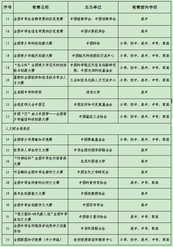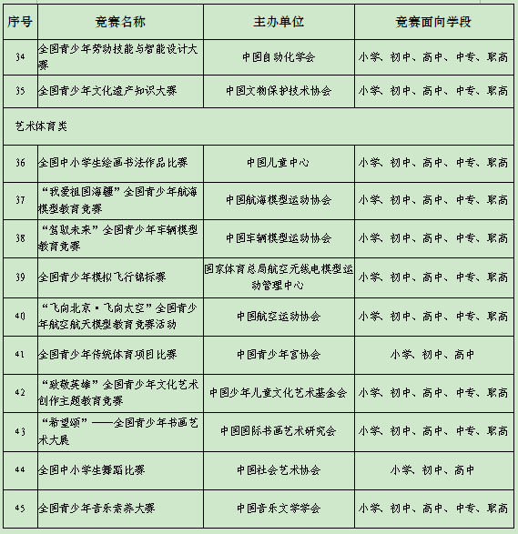 根據(jù)《教育部辦公廳等四部門關于印發(fā)<面向中小學生的全國性競賽活動管理辦法>的通知》精神,由主辦單位自主申報,經(jīng)組織專家進行嚴格評審把關,擬確定全國青少年人工智能創(chuàng)新挑戰(zhàn)賽等45項競賽為2022-2025學年面向中小學生開展的全國性競賽活動,舉辦時間原則上為2022年9月至2025年8月,在此期間每學年舉辦不得超過1次,累計不超過3次?,F(xiàn)就相關信息予以公示,公示期為2022年8月23日至29日。