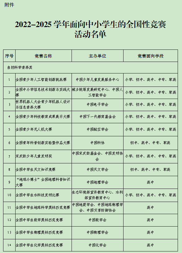 教育部公示2022-2025學年面向中小學生的45項全國性競賽活動名單
