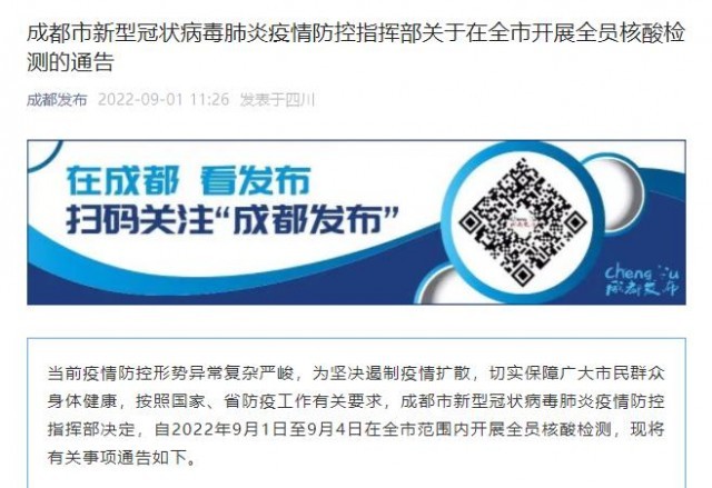 央視網(wǎng)消息:9月1日,成都市新型冠狀病毒肺炎疫情防控指揮部發(fā)布《關(guān)于在全市開展全員核酸檢測(cè)的通告》。
