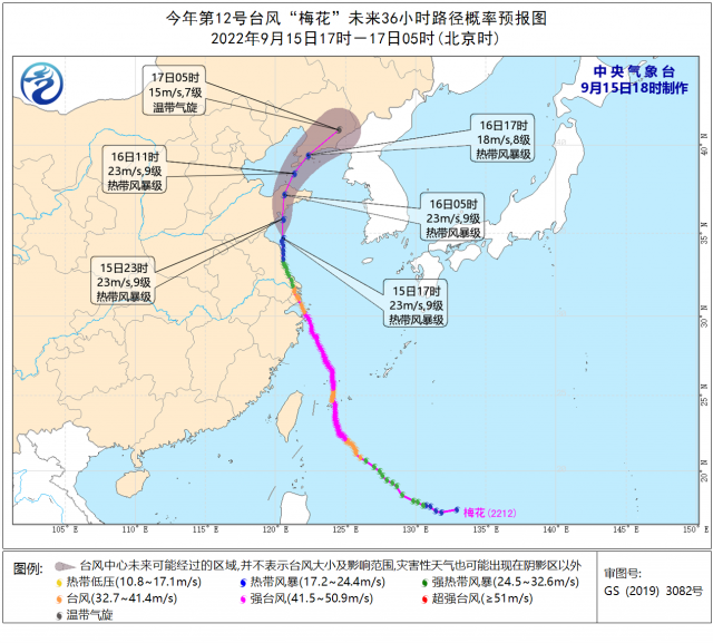 據(jù)中央氣象臺9月15日18時消息,“梅花”目前在黃海南部海面上,將于今天(9月15日)夜間在山東黃島至海陽一帶再次登陸(熱帶風暴級,18-23米/秒,8-9級),并將于明天(9月16日)早晨移入渤海海峽,明天傍晚前后將在遼寧旅順至莊河一帶沿海再次登陸(熱帶風暴級,18-23米/秒,8-9級),之后逐漸變性為溫帶氣旋 。