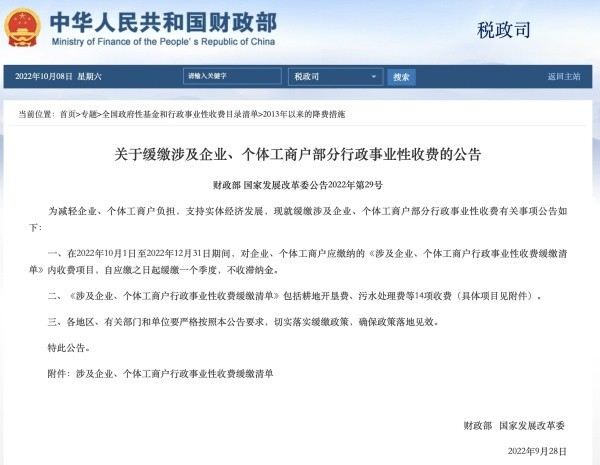 一、在2022年10月1日至2022年12月31日期間,對企業(yè)、個體工商戶應(yīng)繳納的《涉及企業(yè)、個體工商戶行政事業(yè)性收費緩繳清單》內(nèi)收費項目,自應(yīng)繳之日起緩繳一個季度,不收滯納金。