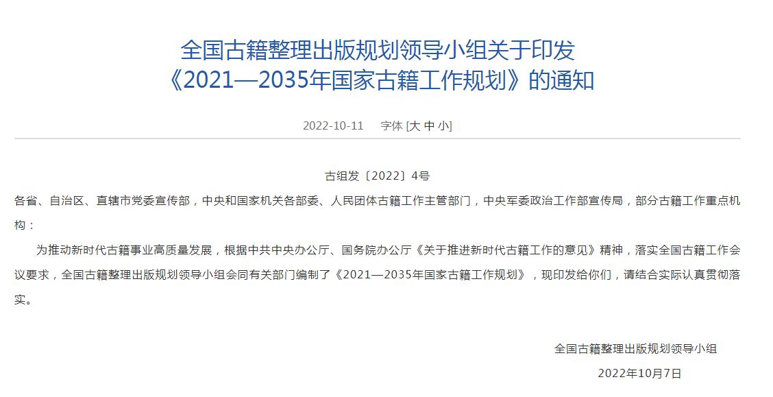 根據(jù)規(guī)劃,到2035年,古籍工作體制機制更加完善,標準規(guī)范體系基本健全,古籍保護、 整理研究和編輯出版成果豐碩,質(zhì)量明顯提升,古籍數(shù)字化資源建設取得重要進展, 古籍普及深入推進,人才隊伍發(fā)展壯大,古籍工作在傳承和弘揚中華優(yōu)秀傳統(tǒng)文化中的作用更加突出。