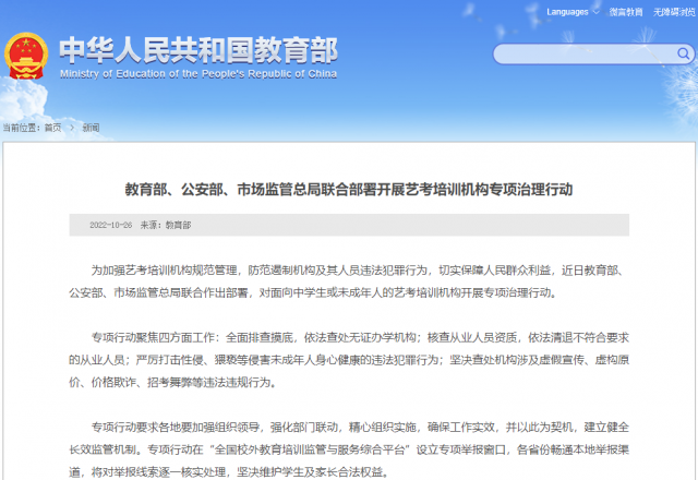據(jù)教育部網(wǎng)站消息,為加強(qiáng)藝考培訓(xùn)機(jī)構(gòu)規(guī)范管理,防范遏制機(jī)構(gòu)及其人員違法犯罪行為,切實(shí)保障人民群眾利益,近日教育部、公安部、市場監(jiān)管總局聯(lián)合作出部署,對(duì)面向中學(xué)生或未成年人的藝考培訓(xùn)機(jī)構(gòu)開展專項(xiàng)治理行動(dòng)。