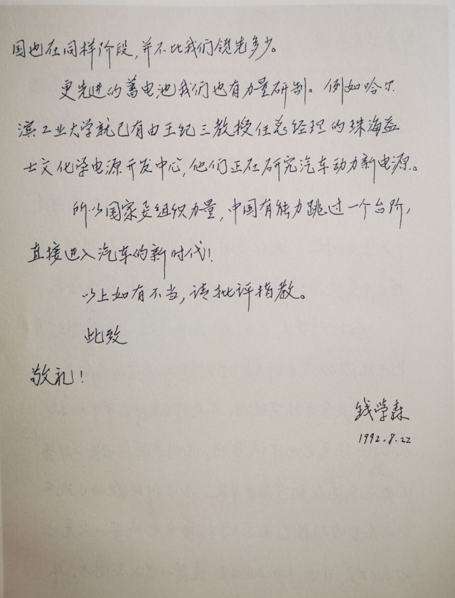 1992年8月22日,錢學森寫信,探討汽車工業(yè)。錢學森圖書館供圖