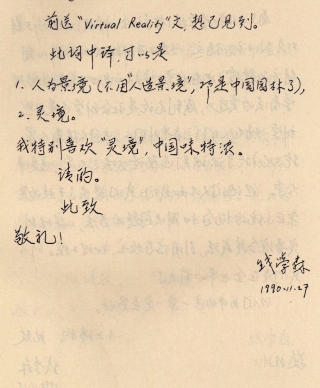 1990年11月27日,錢學森在信中將VR翻譯為“靈境”。錢學森圖書館供圖