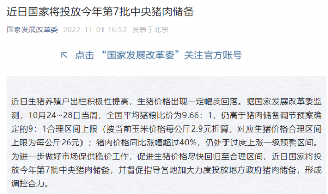 據(jù)國家發(fā)改委消息,為進一步做好市場保供穩(wěn)價工作,促進生豬價格盡快回歸至合理區(qū)間,近日國家將投放今年第7批中央豬肉儲備,并督促指導(dǎo)各地加大力度投放地方政府豬肉儲備,形成調(diào)控合力。