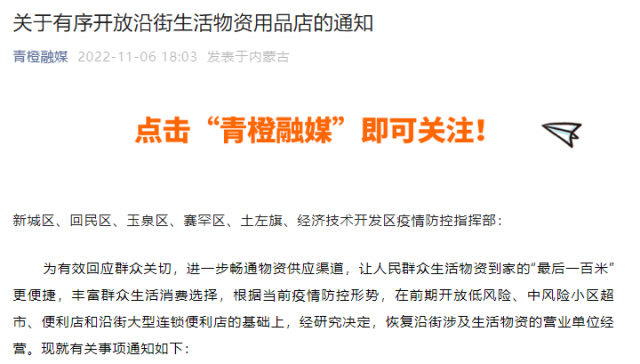 “青橙融媒”微信公眾號(hào)消息,呼和浩特市應(yīng)對(duì)新型冠狀病毒感染肺炎疫情防控工作指揮部市場(chǎng)管控組發(fā)布《關(guān)于有序開(kāi)放沿街生活物資用品店的通知》,具體內(nèi)容如下。