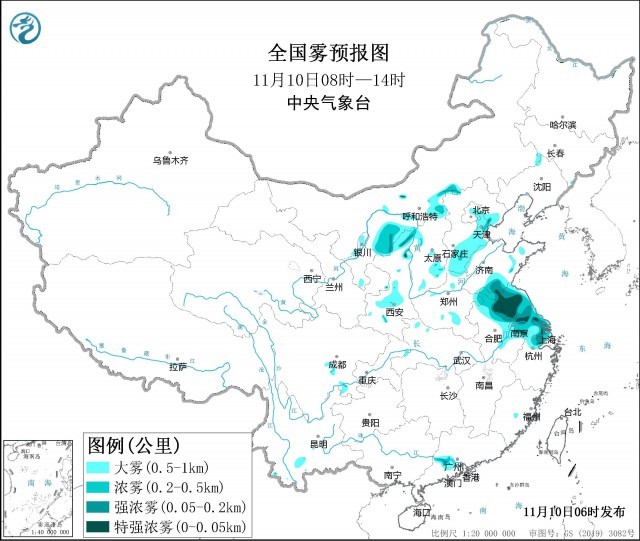 中央氣象臺今天早晨繼續(xù)發(fā)布大霧黃色預(yù)警:預(yù)計,11月10日早晨至上午,北京東部、天津、河北東北部和南部、山西東南部、山東西北部和南部、江蘇、安徽東部、上海、浙江北部以及陜西中北部、內(nèi)蒙古河套地區(qū)等地的部分地區(qū)將有能見度不足1公里的大霧天氣,其中,天津南部、江蘇北部、安徽東北部、上海、浙江北部以及內(nèi)蒙古河套地區(qū)等地的部分地區(qū)有能見度不足500米的濃霧,局地能見度不足50米。