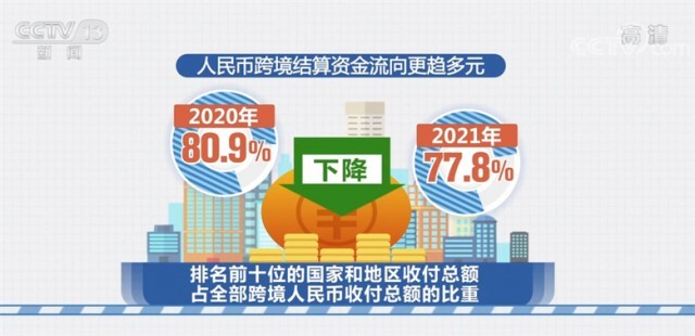 從區(qū)域上來看,人民幣跨境結算資金流向更趨多元,排名前十位的國家和地區(qū)收付總額占全部跨境人民幣收付總額的比重由2020年的80.9%下降至77.8%。