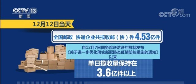 國家郵政局數據顯示,12月1日—12日,郵政快遞行業(yè)攬收量約為43.03億件,同比上升5.6%。12月12日當天,全國郵政、快遞企業(yè)共攬收郵(快)件4.53億件。自12月7日國務院聯防聯控機制發(fā)布《關于進一步優(yōu)化落實新冠肺炎疫情防控措施的通知》以來,單日攬收量保持在3.6億件以上。