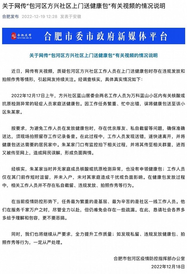 央視網(wǎng)消息:“合肥發(fā)布”微信公眾號(hào)12月19日消息,合肥市包河區(qū)疫情防控指揮部辦公室發(fā)布情況說(shuō)明稱(chēng),近日,網(wǎng)傳有關(guān)視頻,質(zhì)疑包河區(qū)方興社區(qū)工作人員在上門(mén)送健康包時(shí)存在違規(guī)發(fā)放和拍照作秀等情形,引起網(wǎng)友持續(xù)關(guān)注。經(jīng)調(diào)查核實(shí),具體真實(shí)情況如下: