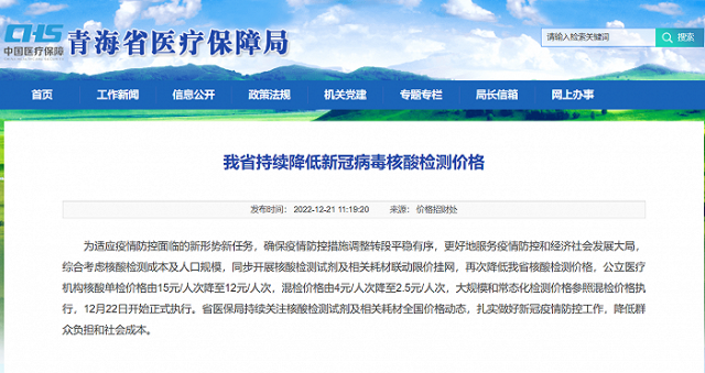 據(jù)青海省醫(yī)療保障局網(wǎng)站消息,為適應(yīng)疫情防控面臨的新形勢新任務(wù),確保疫情防控措施調(diào)整轉(zhuǎn)段平穩(wěn)有序,更好地服務(wù)疫情防控和經(jīng)濟(jì)社會發(fā)展大局,綜合考慮核酸檢測成本及人口規(guī)模,同步開展核酸檢測試劑及相關(guān)耗材聯(lián)動限價掛網(wǎng),再次降低青海省核酸檢測價格,公立醫(yī)療機(jī)構(gòu)核酸單檢價格由15元/人次降至12元/人次,混檢價格由4元/人次降至2.5元/人次,大規(guī)模和常態(tài)化檢測價格參照混檢價格執(zhí)行,12月22日開始正式執(zhí)行。省醫(yī)保局持續(xù)關(guān)注核酸檢測試劑及相關(guān)耗材全國價格動態(tài),扎實(shí)做好新冠疫情防控工作,降低群眾負(fù)擔(dān)和社會成本。