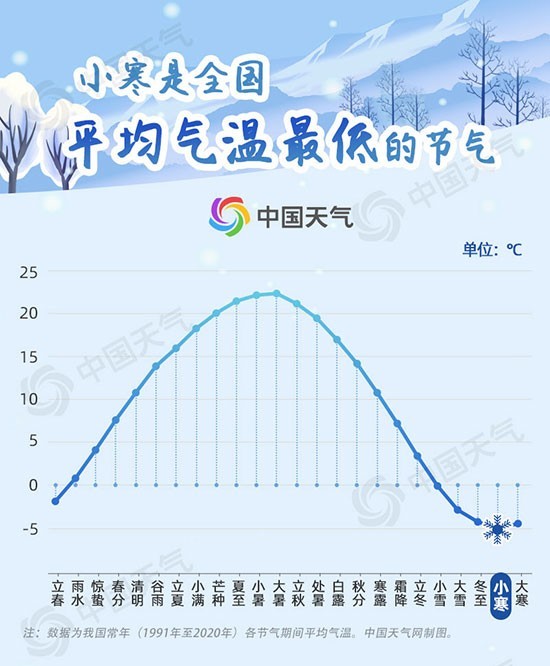 據中國天氣網氣象分析師王偉躍介紹,小寒節(jié)氣冷空氣活動頻繁,氣溫下降明顯,北方天寒地凍,滴水成冰,南方霜雪交加,冷透肌骨。氣象數(shù)據顯示,小寒是二十四節(jié)氣中全國平均氣溫最低的節(jié)氣,僅-5.1℃;其次是大寒節(jié)氣,達-4.5℃。