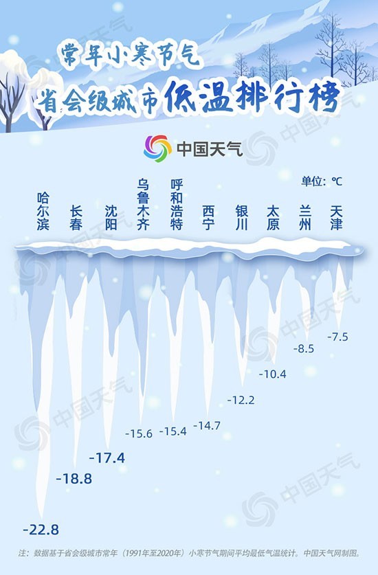 從中國天氣網1991-2020年小寒節(jié)氣省會級城市低溫排行榜可以看出,上榜的均為北方城市,其中哈爾濱以-22.8℃位列榜首,長春和沈陽分別位居第二、第三。