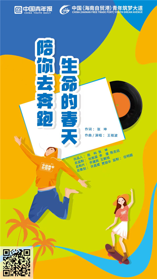 《生命的春天陪你去奔跑》就是這樣一首送給全國青年朋友的MV。這首MV由中國青年報社、共青團海南省委聯(lián)合出品,團海南省委辦公室主任王祖波作曲,一線優(yōu)秀青年代表演唱,平凡人用心創(chuàng)作唱給平凡人聽,希望為家國圓夢創(chuàng)造不平凡的業(yè)績,希望為“中國(海南自貿(mào)港)青年筑夢大道”(以下簡稱“筑夢大道”)插上一起向未來的夢想的翅膀。