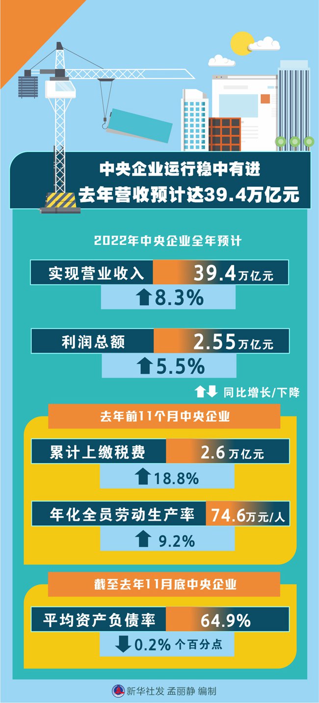 新華社北京1月5日電(記者王希)2022年,國資央企統(tǒng)籌疫情防控和企業(yè)生產(chǎn)經(jīng)營,統(tǒng)籌發(fā)展和安全,推動經(jīng)濟(jì)運(yùn)行實(shí)現(xiàn)穩(wěn)中有進(jìn),中央企業(yè)全年預(yù)計(jì)實(shí)現(xiàn)營業(yè)收入39.4萬億元、利潤總額2.55萬億元,同比分別增長8.3%和5.5%。