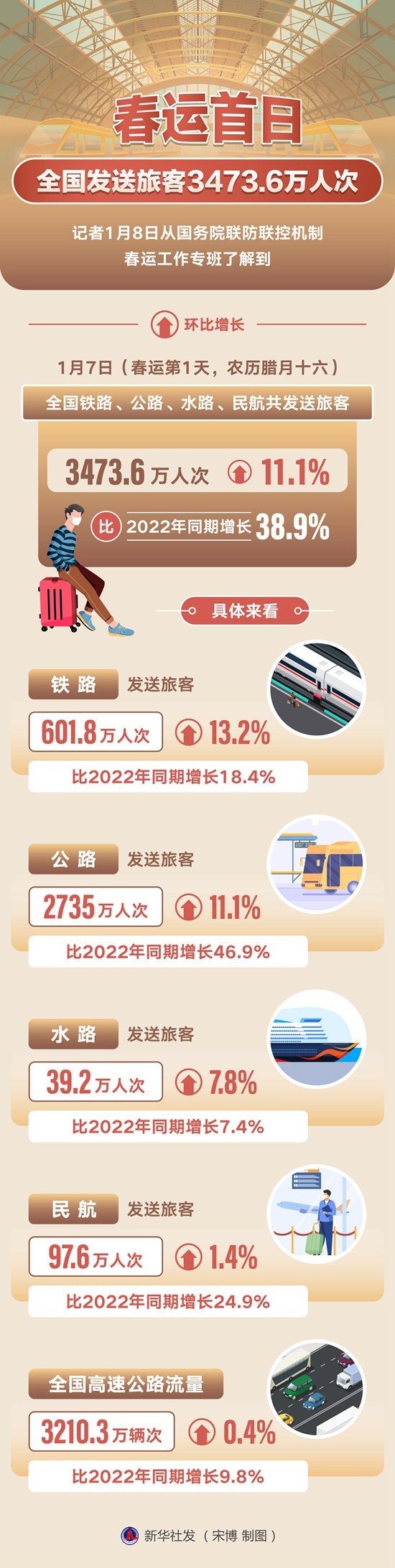 記者1月8日從國務院聯(lián)防聯(lián)控機制春運工作專班了解到,1月7日(春運第1天,農(nóng)歷臘月十六)全國鐵路、公路、水路、民航共發(fā)送旅客3473.6萬人次,環(huán)比增長11.1%,比2022年同期增長38.9%。宋博/制圖(新華社發(fā))