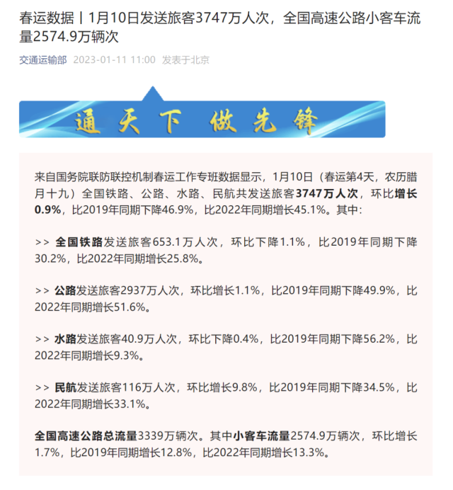 來自國務(wù)院聯(lián)防聯(lián)控機(jī)制春運(yùn)工作專班數(shù)據(jù)顯示,1月10日(春運(yùn)第4天,農(nóng)歷臘月十九)全國鐵路、公路、水路、民航共發(fā)送旅客3747萬人次,環(huán)比增長0.9%,比2019年同期下降46.9%,比2022年同期增長45.1%。其中: