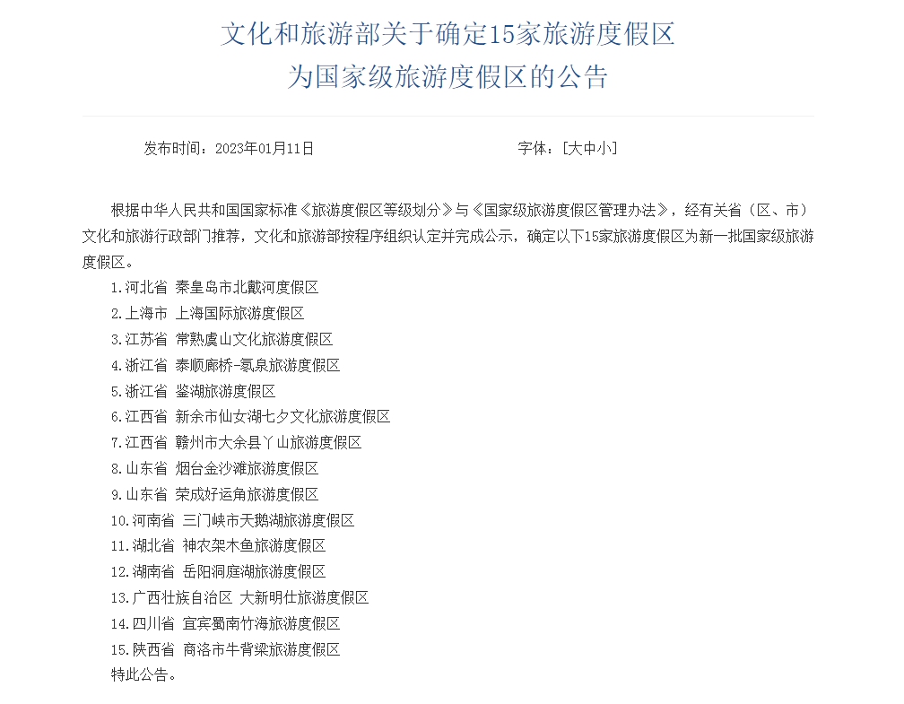 中新網(wǎng)1月11日電 據(jù)文旅部網(wǎng)站顯示,根據(jù)中華人民共和國(guó)國(guó)家標(biāo)準(zhǔn)《旅游度假區(qū)等級(jí)劃分》與《國(guó)家級(jí)旅游度假區(qū)管理辦法》,經(jīng)有關(guān)省(區(qū)、市)文化和旅游行政部門推薦,文化和旅游部按程序組織認(rèn)定并完成公示,確定以下15家旅游度假區(qū)為新一批國(guó)家級(jí)旅游度假區(qū):