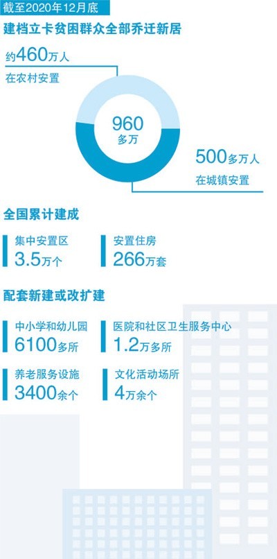 習(xí)近平總書記強(qiáng)調(diào):“易地搬遷是解決一方水土養(yǎng)不好一方人、實(shí)現(xiàn)貧困群眾跨越式發(fā)展的根本途徑,也是打贏脫貧攻堅戰(zhàn)的重要途徑?!秉h的十八大以來,全國累計建成集中安置區(qū)3.5萬個、安置住房266萬套。到2020年底,全國易地扶貧搬遷規(guī)劃建設(shè)任務(wù)全面完成,近千萬生活在“一方水土難養(yǎng)一方人”地方的建檔立卡貧困人口實(shí)現(xiàn)易地扶貧搬遷,搬入新家園、開啟新生活。