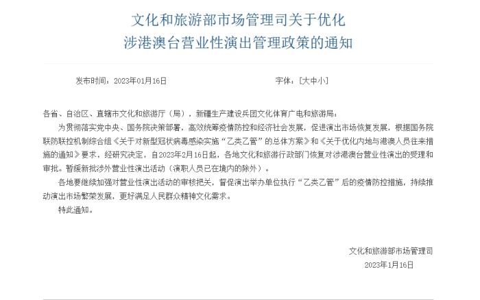 《通知》提到,根據(jù)國務(wù)院聯(lián)防聯(lián)控機(jī)制綜合組《關(guān)于對(duì)新型冠狀病毒感染實(shí)施“乙類乙管”的總體方案》和《關(guān)于優(yōu)化內(nèi)地與港澳人員往來措施的通知》要求,經(jīng)研究決定,自2023年2月16日起,各地文化和旅游行政部門恢復(fù)對(duì)涉港澳臺(tái)營業(yè)性演出的受理和審批。暫緩新批涉外營業(yè)性演出活動(dòng)(演職人員已在境內(nèi)的除外)。