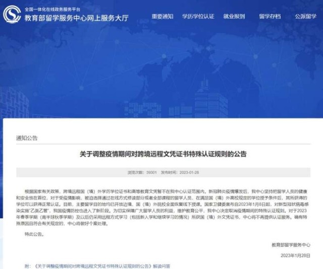 中國(guó)青年報(bào)客戶(hù)端北京1月29日電(中青報(bào)·中青網(wǎng)記者 葉雨婷)記者從教育部留學(xué)服務(wù)中心(以下簡(jiǎn)稱(chēng)“中心”)官方網(wǎng)站獲悉,1月28日,中心發(fā)布《關(guān)于調(diào)整疫情期間對(duì)跨境遠(yuǎn)程文憑證書(shū)特殊認(rèn)證規(guī)則的公告》指出,對(duì)于2023年春季學(xué)期(南半球秋季學(xué)期)及以后仍采用遠(yuǎn)程方式學(xué)習(xí)(包括新入學(xué)和繼續(xù)學(xué)習(xí)的情況)所獲國(guó)(境)外文憑證書(shū),中心將不再提供認(rèn)證服務(wù)。