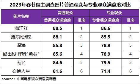 中國電影觀眾滿意度調(diào)查 2023年春節(jié)檔調(diào)查結(jié)果顯示,春節(jié)檔觀眾滿意度得分87.1分,同比增長1.8分,為2015年開始調(diào)查以來春節(jié)檔期最高分,同時(shí)居歷史調(diào)查各檔期滿意度第三位。檔期調(diào)查的6部影片均進(jìn)入“滿意”區(qū)間(≥80分),其中滿意度超過85分的影片有4部(《滿江紅》88.4分,《流浪地球2》88.0分,《深海》85.3分,《熊出沒·伴我“熊芯”》85.2分),數(shù)量為歷年春節(jié)檔之最。