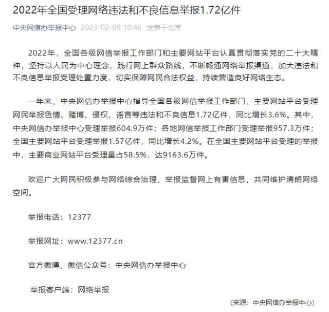 2022年全國受理網絡違法和不良信息舉報1.72億件