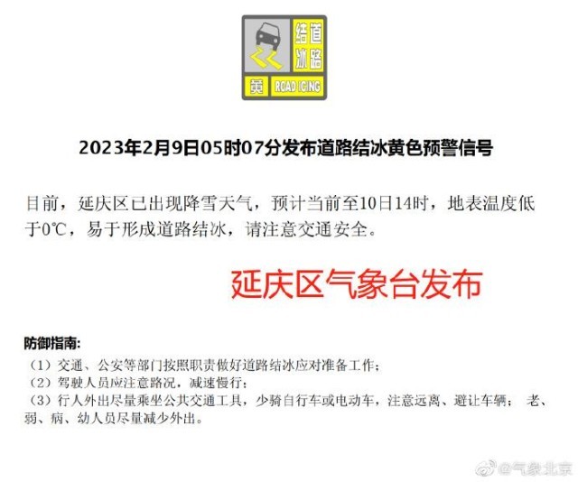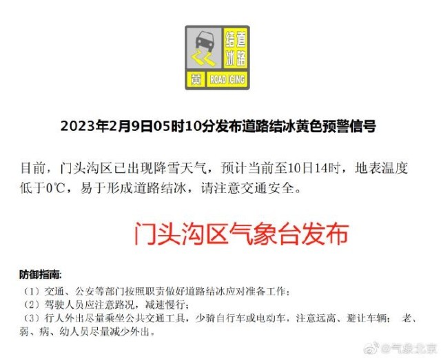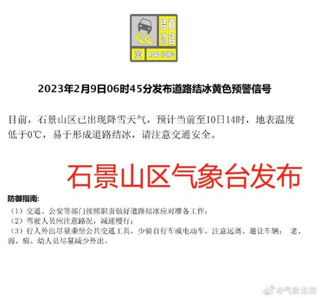 另外,目前石景山、門頭溝、延慶區(qū)氣象臺已發(fā)布道路結(jié)冰黃色預(yù)警信號,上述區(qū)域已出現(xiàn)降雪,易形成道路結(jié)冰,請大家出行注意交通安全。