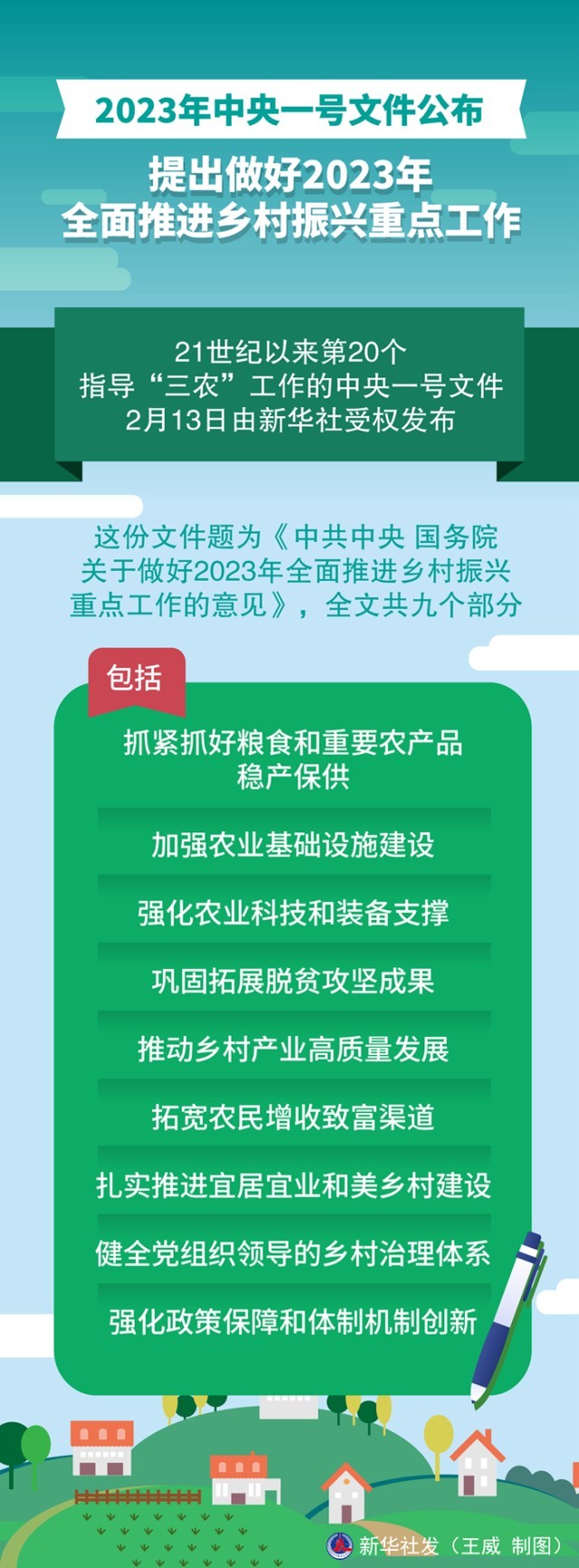 這份文件題為《中共中央 國(guó)務(wù)院關(guān)于做好2023年全面推進(jìn)鄉(xiāng)村振興重點(diǎn)工作的意見》,全文共九個(gè)部分,包括:抓緊抓好糧食和重要農(nóng)產(chǎn)品穩(wěn)產(chǎn)保供、加強(qiáng)農(nóng)業(yè)基礎(chǔ)設(shè)施建設(shè)、強(qiáng)化農(nóng)業(yè)科技和裝備支撐、鞏固拓展脫貧攻堅(jiān)成果、推動(dòng)鄉(xiāng)村產(chǎn)業(yè)高質(zhì)量發(fā)展、拓寬農(nóng)民增收致富渠道、扎實(shí)推進(jìn)宜居宜業(yè)和美鄉(xiāng)村建設(shè)、健全黨組織領(lǐng)導(dǎo)的鄉(xiāng)村治理體系、強(qiáng)化政策保障和體制機(jī)制創(chuàng)新。