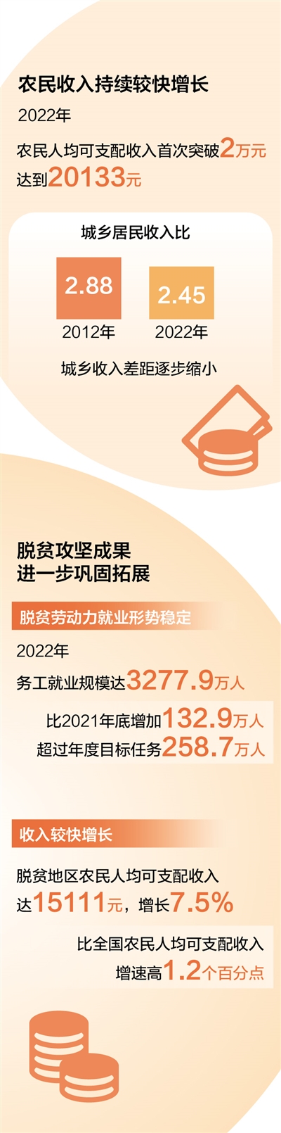 增加農(nóng)民收入是“三農(nóng)”工作的中心任務(wù)。2022年,農(nóng)民人均可支配收入首次突破2萬元,城鄉(xiāng)居民收入比從2012年的2.88下降到2022年的2.45,城鄉(xiāng)收入差距逐步縮小?!耙惨吹?,當(dāng)前農(nóng)民收入增速有所放緩,增收動能有所減弱。必須高度重視,拿出長短結(jié)合、務(wù)實管用的硬措施,拓寬農(nóng)民增收致富渠道?!敝醒朕r(nóng)辦專職副主任、農(nóng)業(yè)農(nóng)村部黨組成員吳宏耀說。對此,今年中央一號文件在穩(wěn)定就業(yè)、經(jīng)營增效、挖潛財產(chǎn)收入以及拓展轉(zhuǎn)移收入等方面作出相關(guān)部署,努力讓農(nóng)民腰包越來越鼓,日子越過越紅火。