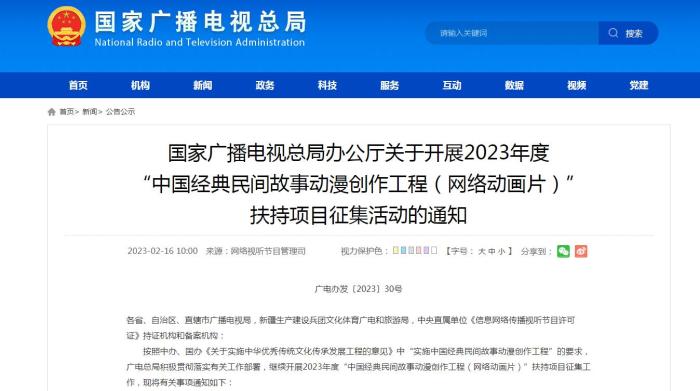 中新網(wǎng)2月16日電 16日,國(guó)家廣播電視總局辦公廳發(fā)布關(guān)于開展2023年度“中國(guó)經(jīng)典民間故事動(dòng)漫創(chuàng)作工程(網(wǎng)絡(luò)動(dòng)畫片)”扶持項(xiàng)目征集活動(dòng)的通知,旨在打造廣受觀眾認(rèn)可、具有較大影響力的優(yōu)秀作品。