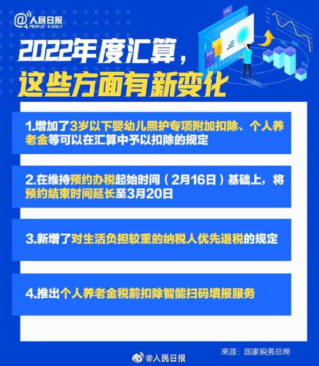 2022年度個(gè)稅匯算將于3月1日起開始,2月16日起可以提前預(yù)約辦稅。納稅人如需在3月1日至3月20日之間辦理年度匯算,可在2月16日至3月20日每天的早6點(diǎn)至晚22點(diǎn)登錄手機(jī)個(gè)人所得稅APP進(jìn)行預(yù)約。2022年度退補(bǔ)稅怎么辦理?2022年度匯算新變化又有哪些?詳戳