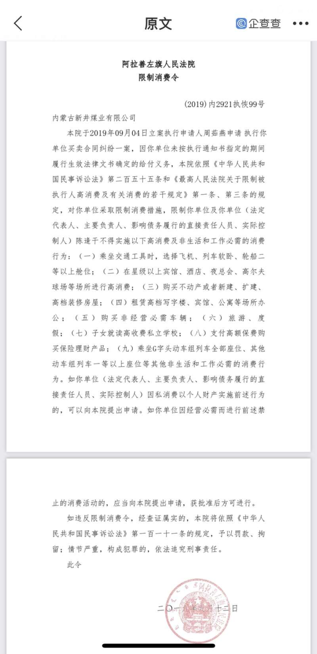 據(jù)了解,內(nèi)蒙古新井煤業(yè)有限公司于1999年登記成立,企查查平臺顯示,該公司多次涉及買賣合同糾紛、租賃合同糾紛、借款合同糾紛等,后被法院列為失信被執(zhí)行人,公司法定代表人也曾多次被法院限制高消費。