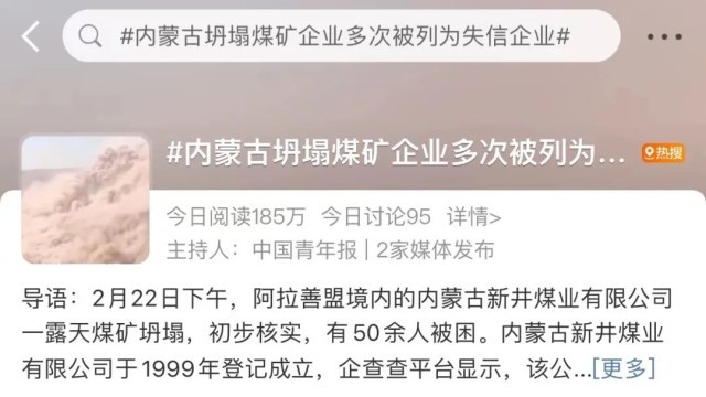 2月22日,內(nèi)蒙古阿拉善盟阿拉善左旗新井煤業(yè)有限公司一露天煤礦發(fā)生大面積坍塌,有工作人員和車輛被埋。