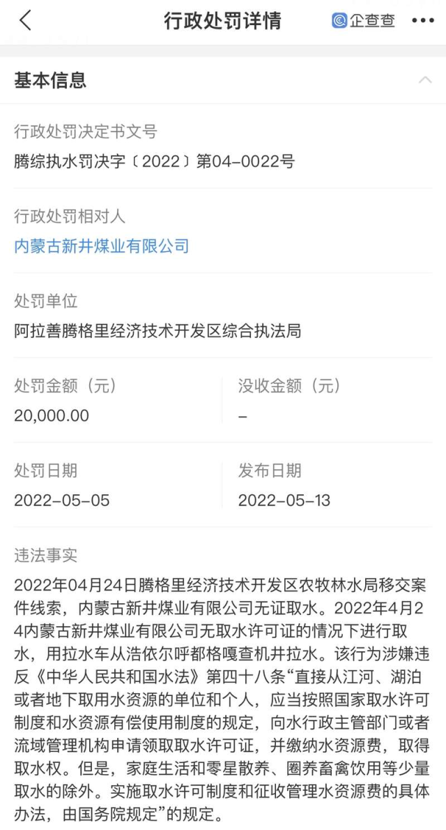 2022年該公司欠繳資源稅800多萬元、增值稅200多萬元,還因無取水許可證的情況下取水,被阿拉善騰格里經(jīng)濟技術(shù)開發(fā)區(qū)綜合執(zhí)法局行政處罰2萬元。